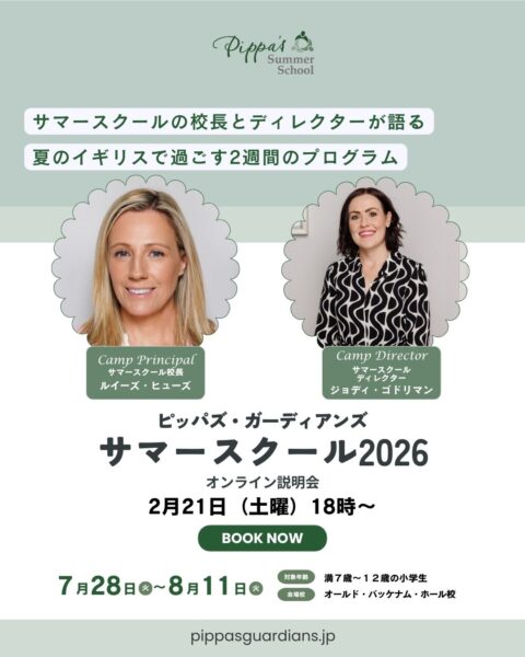 ピッパズ・ガーディアンズのサマースクールの特徴と昨年の様子をお伝えするオンライン説明会を開催します。イギリスからサマースクールのプリンシパルのルイーズ・ヒューズとディレクターのジョディ・ゴドリマンもご挨拶をさせていただきます。昨年の様子を振り返りながら、今年新たにプログラムに加わるアクティビティなどのご説明もいたします。皆さまからのご質問にお答えする時間も設けますので、ご家族ご一緒にご参加ください。