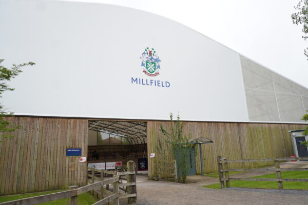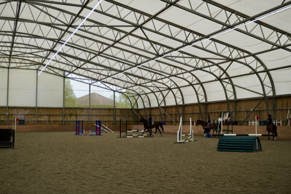 ミルフィールド・スクールの場内の馬場では、時間ごとに細かく区切られ、特別レッスンが行われている